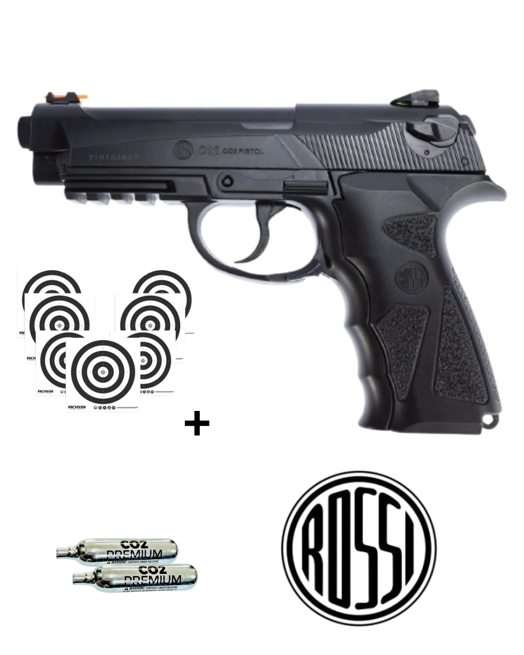 Chegou a Pistola de Pressão Co2 Rossi C12, fabricada pela Wingun, seguindo a linha da C11 4.5mm. Duas pistolas muito parecidas em questão de desempenho. Sua ação é por cilindro Co2 e não possui Blowback, sendo uma pistola com maior autonomia e força. Conta com trilho inferior 22mm, alça e massa de mira em fibra óptica e velocidade de 133m/s